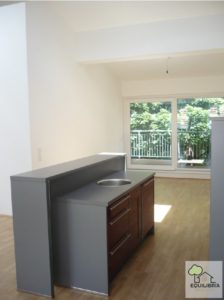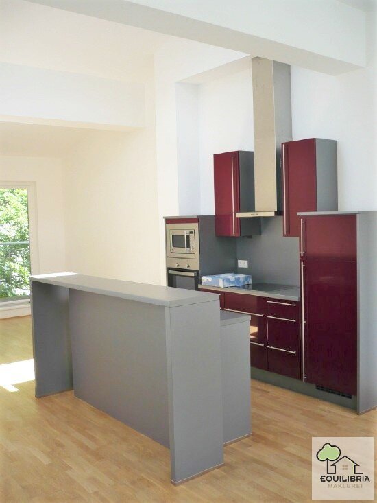 Vom zentralen Vorzimmer aus gelangen Sie ins Granit-Bad mit Wanne + Dusche, in das separate WC mit Handwaschbecken, in die beiden größzügigen Zimmer und den großen Wohnbereich (ca. 43m²) mit integrierter, voll ausgestatteter Küche mit Dunstabzug ins Freie. Diese Wohnküche ist so großzügig konzipiert, dass viele Möblierungsvarianten machbar sind. Die Terrasse blickt direkt auf die grünen Blätter eines im Hofbereich stehenden Baumes. Eine einzigartige, urbane und dennoch erholsame Atmosphäre. Der Boden Ist Massiv Parkett Eiche.
