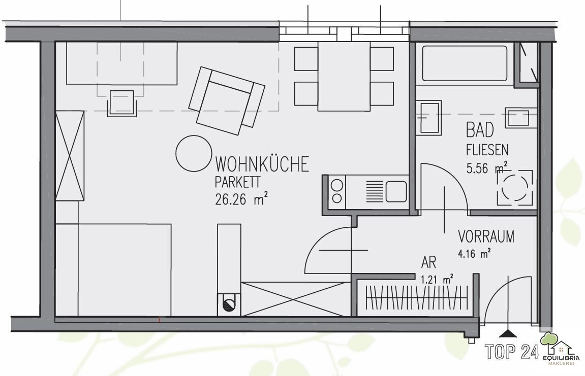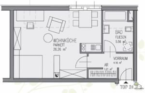 Man betritt über einen ca. 4, m² großen Vorraum die Wohnung und im Anschluss gelangt man in die ca. 26m2 große Wohnküche.
