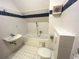 Vis á vis vom Eingang liegt das Badezimmer mit Badewanne , Handwaschbecken, WC, Lüftung sowie Waschmaschinenanschluss.