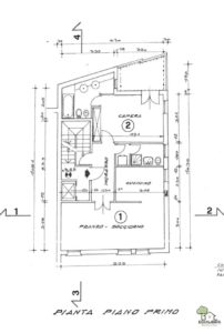 b) im 1. OG befindet sich das große Wohnzimmer mit angeschlossener Küche, ein Bad, ein WC, ein Abstellraum, das zentrale Vorzimmer sowie eine Terrasse, welche vom Schlafzimmer aus betretbar ist