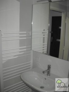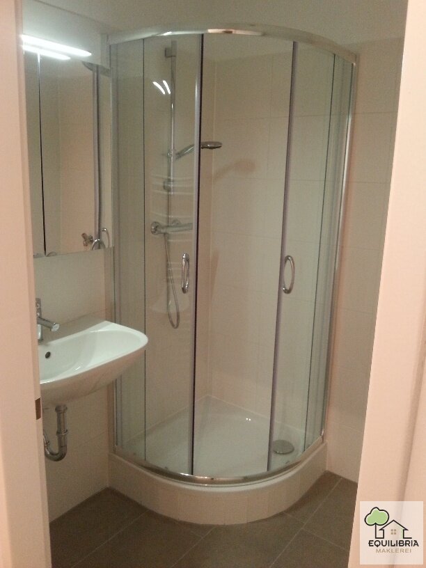 - Badezimmer mit Dusche, Waschbecken, Waschmaschinenanschluss und Handtuchheizer