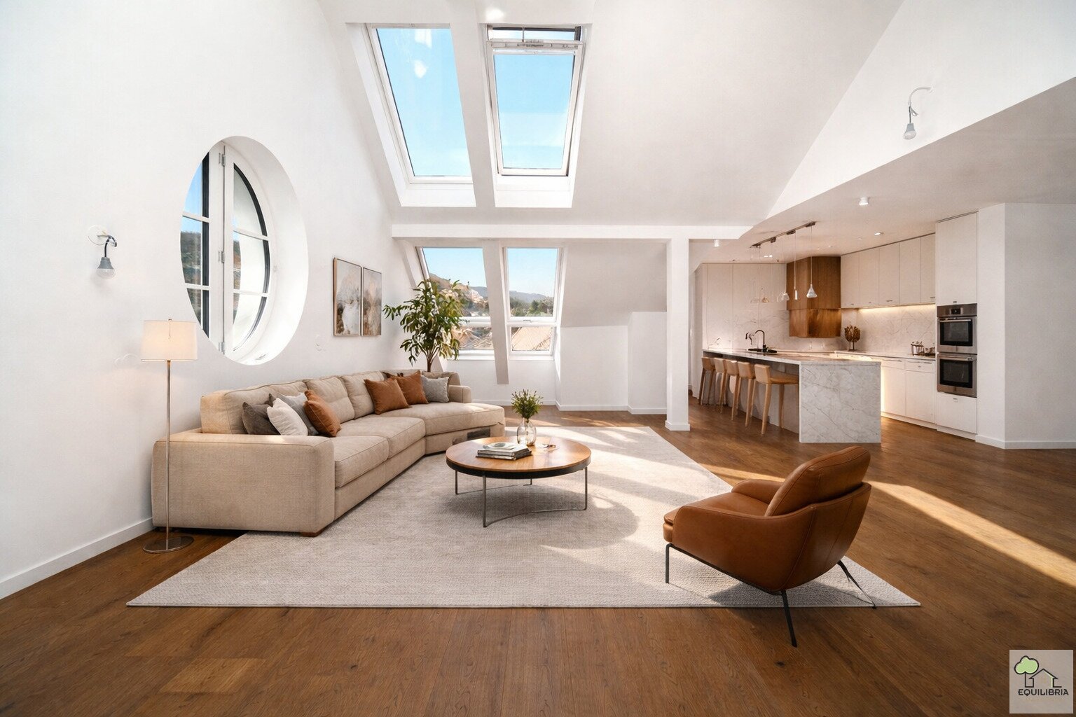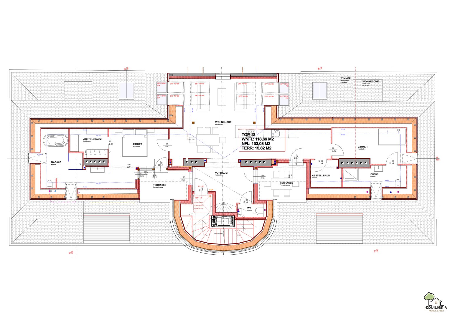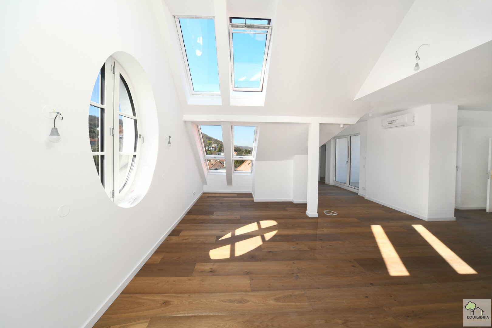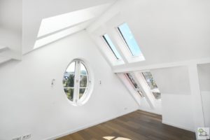 Die Top 12 verfügt über einen eigenen Zugang und erstreckt sich über das gesamte 2.Dachgeschoß, mit Blick in alle Richtungen. Das ovale Fenster liegt genau in der Mitte der Wohnung, oberhalb des Erkers, nach Süden (blauer Pfeil im Plan).