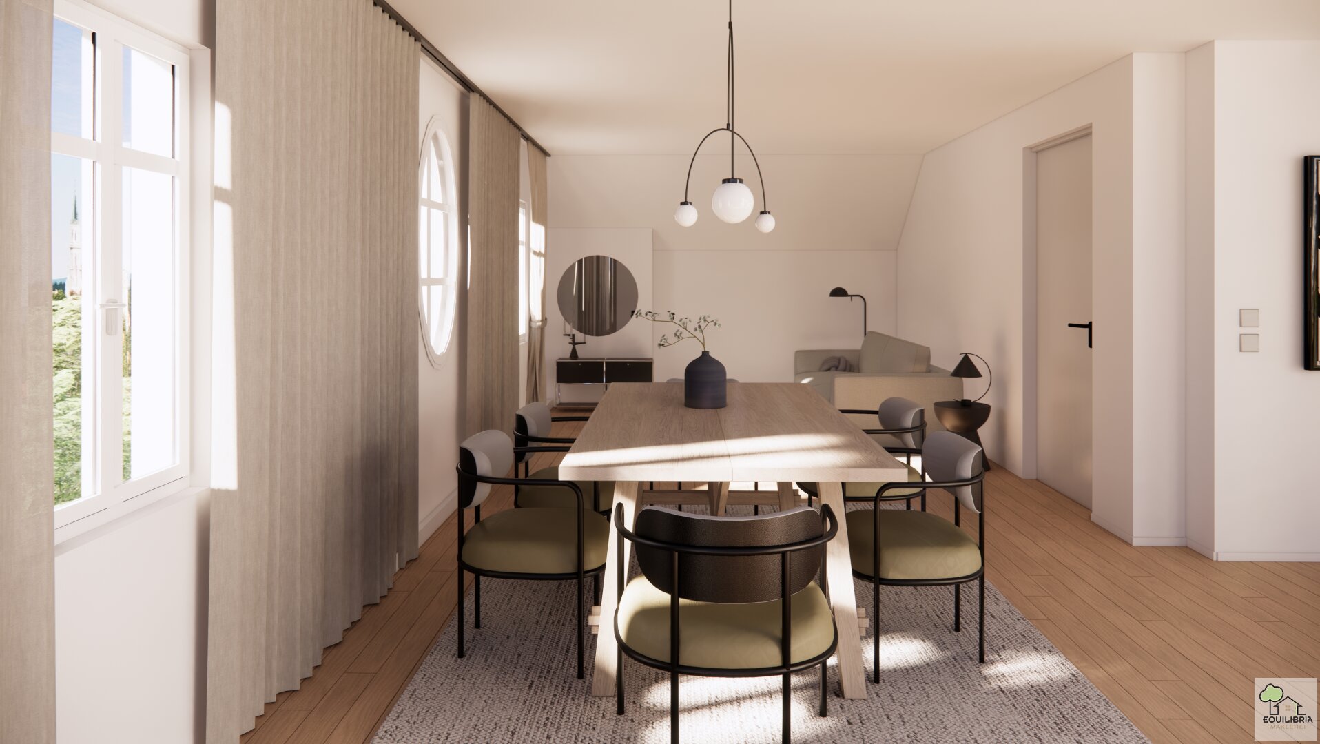 Das ovale Fenster bietet aus der großzügigen Wohnküche einen spektakulären Ausblick auf das Stift Klosterneuburg (blauer Pfeil im Plan).