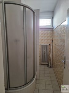 - Badezimmer mit Dusche, Waschbecken und Waschmaschinenanschluss