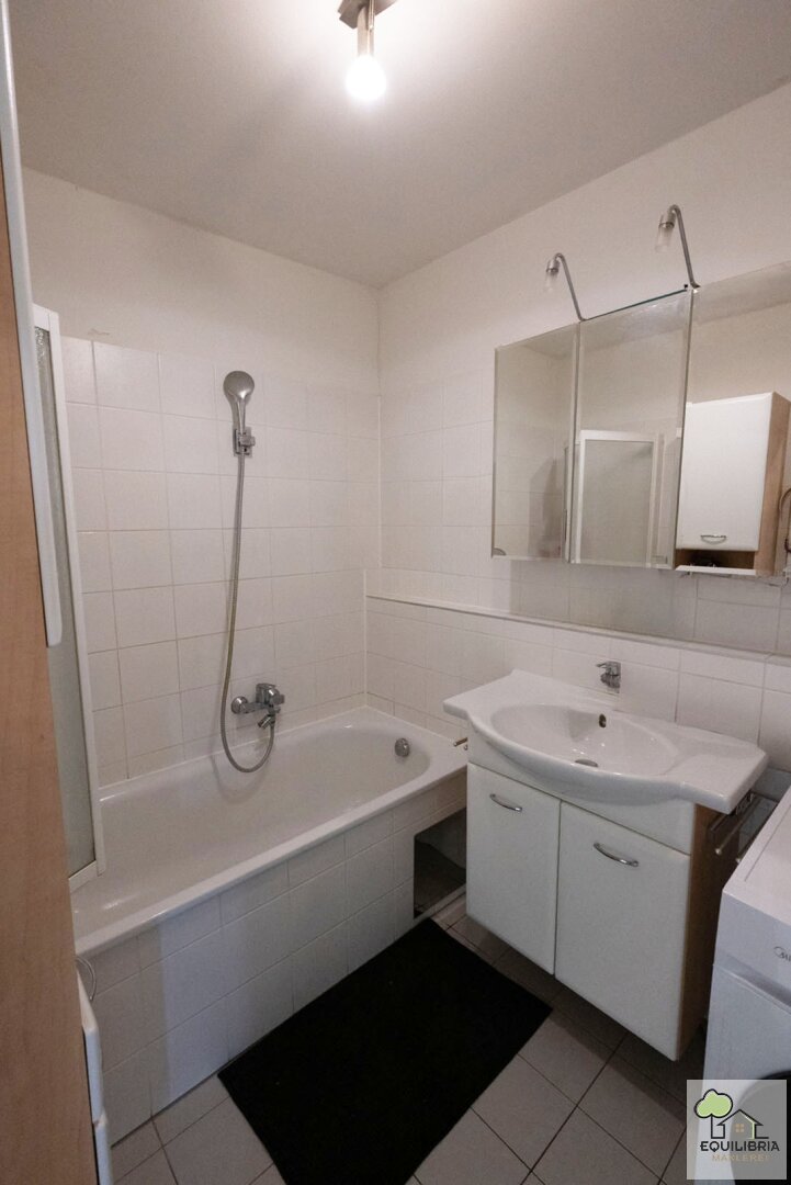 - Badezimmer mit Badewanne, Waschbecken und Waschmaschinenanschluss