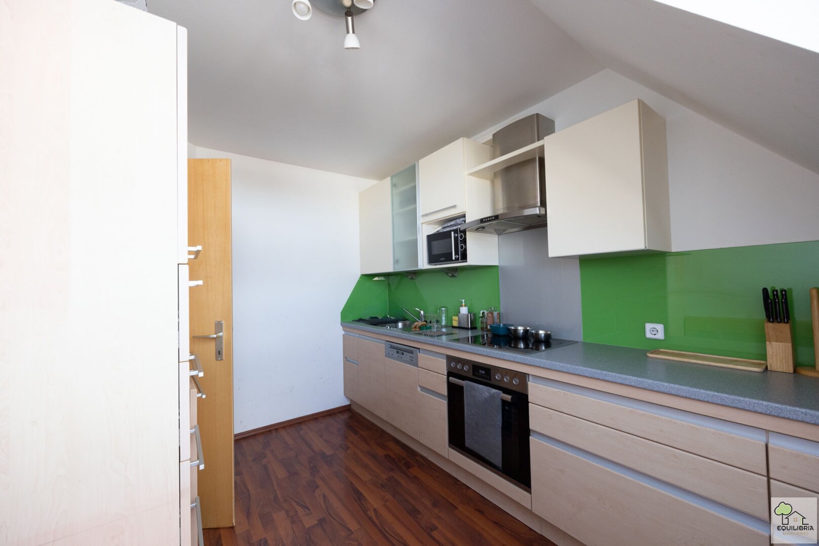 Die geräumige und offene Küche ist der perfekte Ort, um mit der Familie oder Freunden gemütlich zusammenzusitzen. Die Einbauküche ist mit hochwertigen Geräten ausgestattet und bietet viel Stauraum.