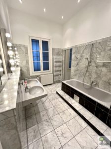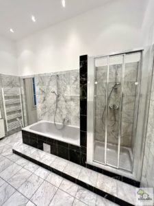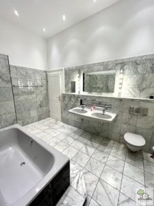 Links vom Vorraum gelangt man über einen weiteren kleinen Vorraum (ca. 2 m²) in das Bad, welches mit einer Dusche und einer Badewanne sowie einem Doppelwaschbecken ausgestattet ist und weiter in ein Kabinett mit Gangfenster.