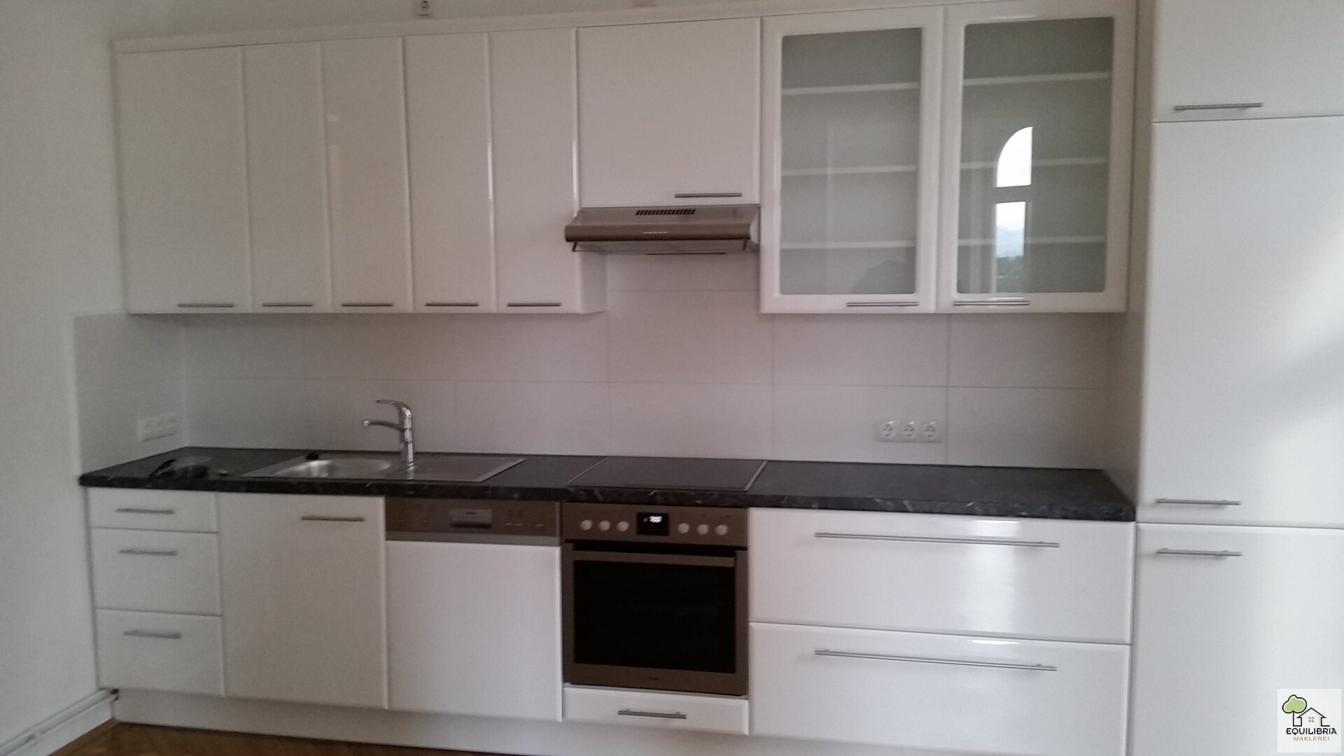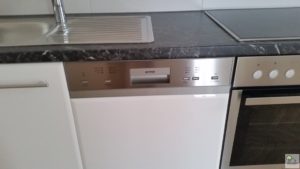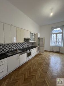 Rechts vom Vorraum gelangt man in das neu verflieste WC mit Zentralheizung und Handwaschbecken sowie in die Küche. Diese besticht durch einen weißen Lackverbau mit schwarzer Arbeitsplatte sowie einen Herd mit Ceranfeld, Dunstabzug, einen Geschirrspüler, einen Einbaukühlschrank und eine Nirosta-Spüle.