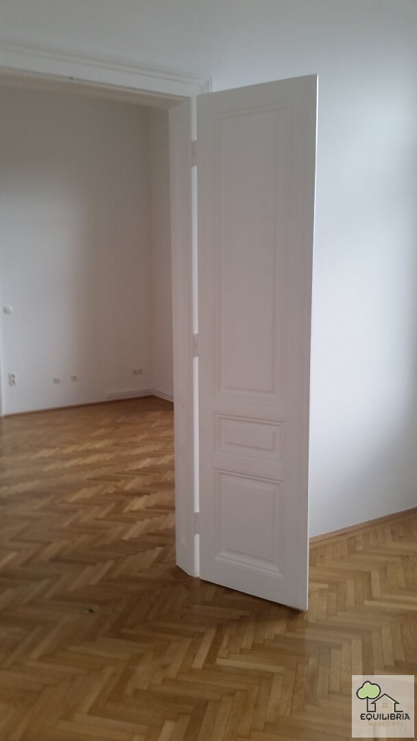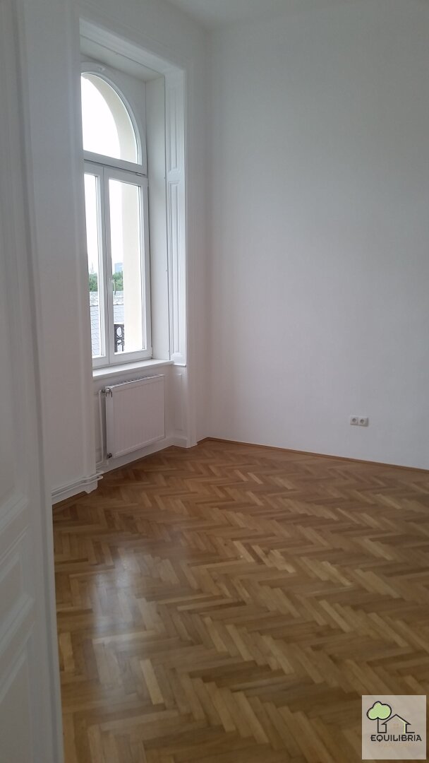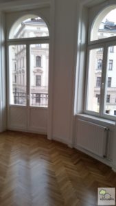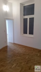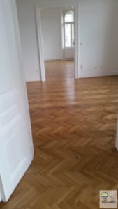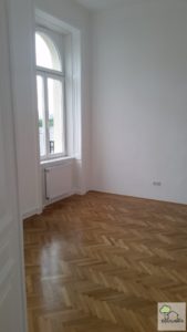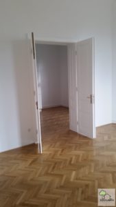 Vom ca. 13 m² großen Vorraum gelangt man in die 3 Hauptzimmer der Wohnung (diese sind in etwa gleich groß: 2 Zimmer haben ca. 25 m² und 1 Zimmer hat knapp 20 m² Wohnfläche). Der neu versiegelte Parkettboden spiegelt das Licht durch die großen, neuen Fenster.