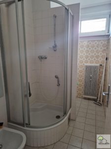 - Badezimmer mit Dusche, Waschbecken und Waschmaschinenanschluss