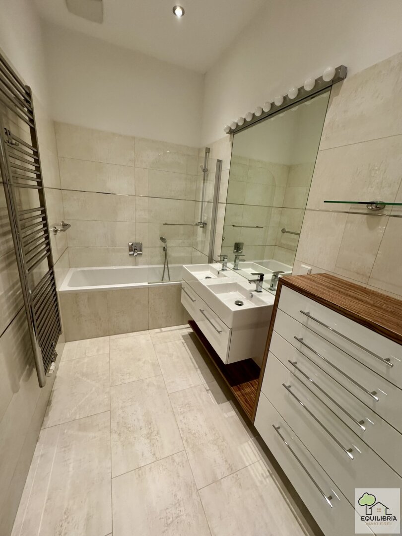 - Stilvoll saniertes Badezimmer mit Badewanne (inkl. Duschfunktion), Doppelwaschbecken, großem Spiegel und Handtuchheizkörper