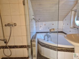 - Badezimmer mit Eckbadewanne, Dusche mit Glastür und Toilette