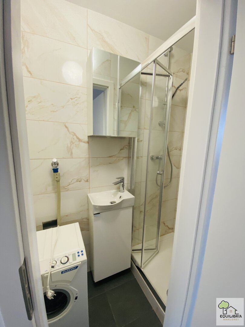 Das Badezimmer ist mit einer Dusche und einer Waschmaschine ausgestattet.